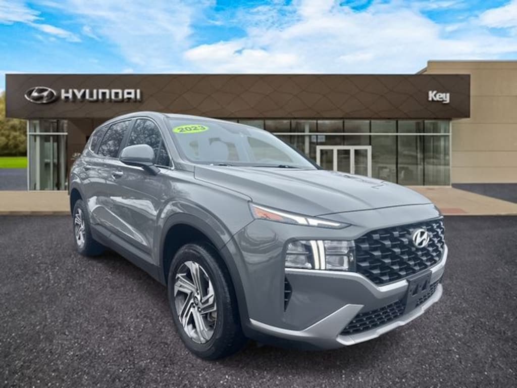 AWD, Black Cloth, 18" x 7.5J Alloy Wheels, 4-Wheel Disc Brakes, 6 Speakers, ABS brakes, Air Conditioning, Alloy wheels, AM/FM radio, Apple CarPlay & Android Auto, Auto High-beam Headlights, Axle Ratio: 4.081, Brake assist, Bumpers: body-color, Cargo Cover/Screen, Cargo Net, Cargo Package, Cargo Tray, Carpeted Floor Mats, Delay-off headlights, Driver door bin, Driver vanity mirror, Dual front impact airbags, Dual front side impact airbags, Electronic Stability Control, Exterior Parking Camera Rear, First Aid Kit, Four wheel independent suspension, Front anti-roll bar, Front Bucket Seats, Front Center Armrest, Front reading lights, Fully automatic headlights, Illuminated entry, Low tire pressure warning, Occupant sensing airbag, Option Group 01, Outside temperature display, Overhead airbag, Overhead console, Panic alarm, Passenger door bin, Passenger vanity mirror, Power door mirrors, Power steering, Power windows, Radio: AM/FM Display Audio, Rear anti-roll bar, Rear seat center armrest, Rear window defroster, Rear window wiper, Remote keyless entry, Security system, Speed control, Speed-sensing steering, Split folding rear seat, Spoiler, Stain-Resistant Cloth Seat Trim, Steering wheel mounted audio controls, Tachometer, Telescoping steering wheel, Tilt steering wheel, Traction control, Trip computer, Variably intermittent wipers, Wheel Locks. Certified. Hampton Gray 2023 Hyundai Santa Fe SE AWD 8-Speed Automatic with SHIFTRONIC 2.5L I4